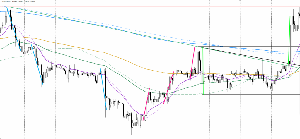 緑の値幅はチャートにおける波の支配領域であるある角度から外れた時を示すが、これもこの値幅分の上昇となっている。