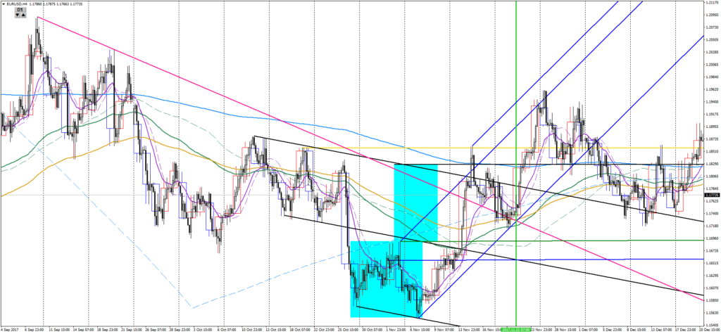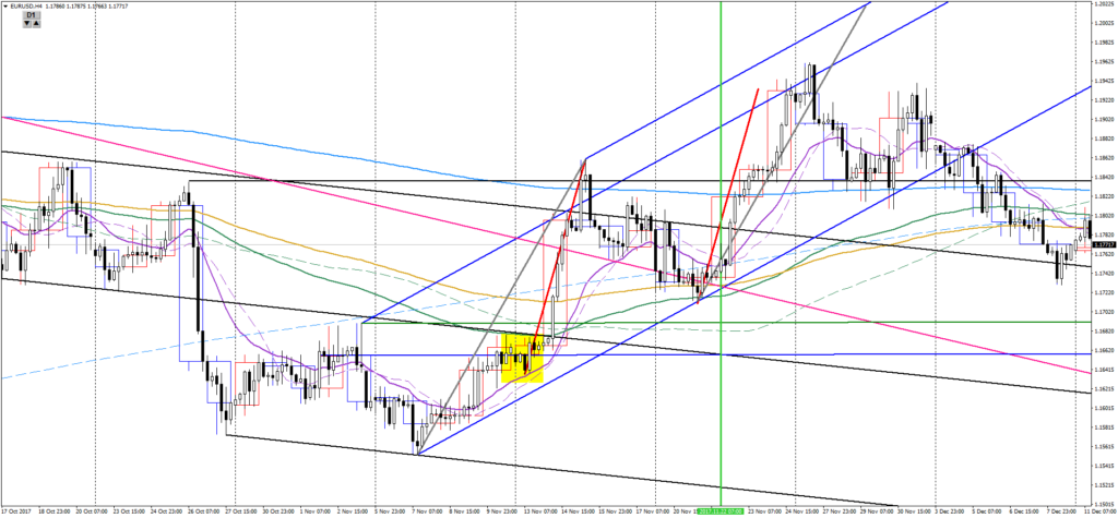 また細い赤と青の線で複数のローソク足が一塊に囲われているものは、現在の4H足のチャートに日足のローソク足を描写したものとなっている。