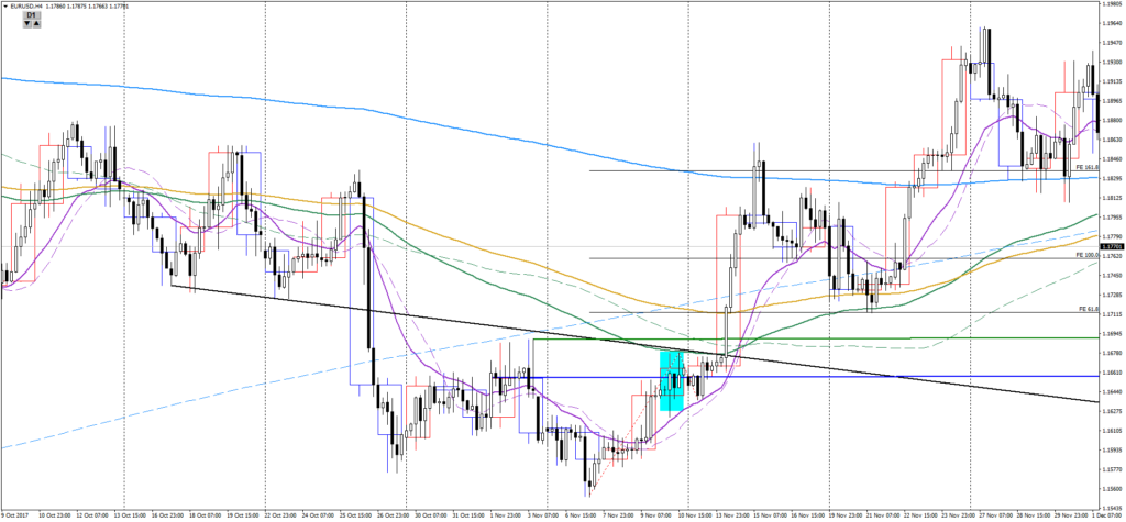 4時間足のチャートに日足のローソクを描写すると、この価格は日足のローソク足の実体で止まった位置であり、水色四角部の値動きは日足のローソクの実体を伴ってこの価格を超えていたのである。